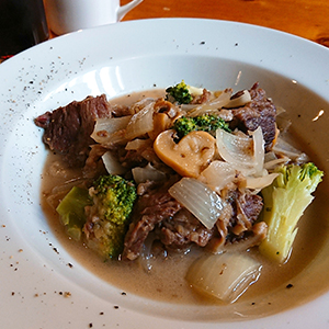 クールブイヨンと赤ワインでじっくり6時間煮込んだお肉は、箸でもくずれるぐらいホロホロ♪ 北海道産生クリームとサワークリームでコクのある味わいです。